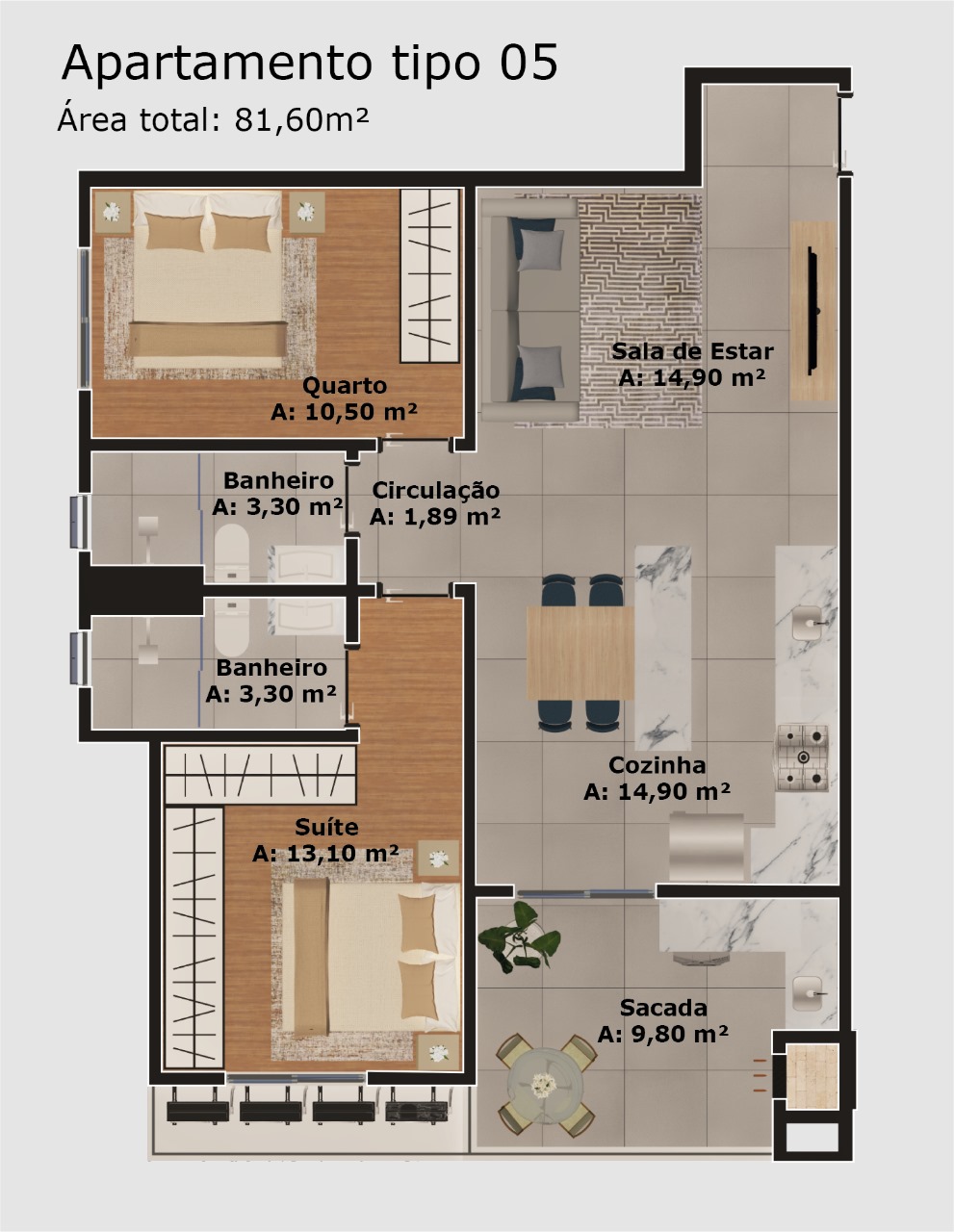 Apartamento tipo 5: 81,60 m² - 1 suite + 1 dormitorio