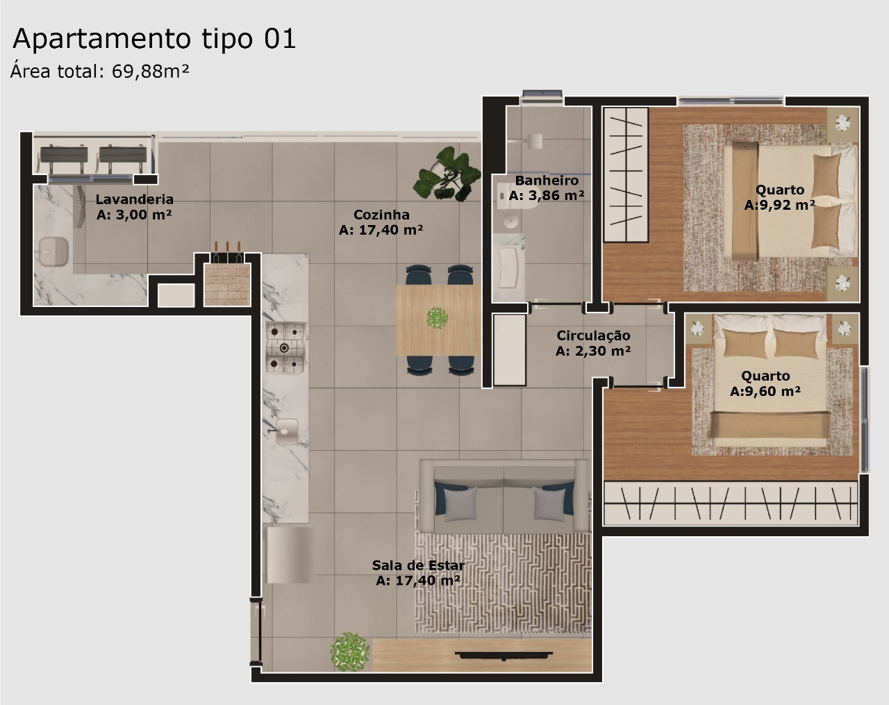 Apartamento tipo 1: 69,90 m² - 2 dormitorios