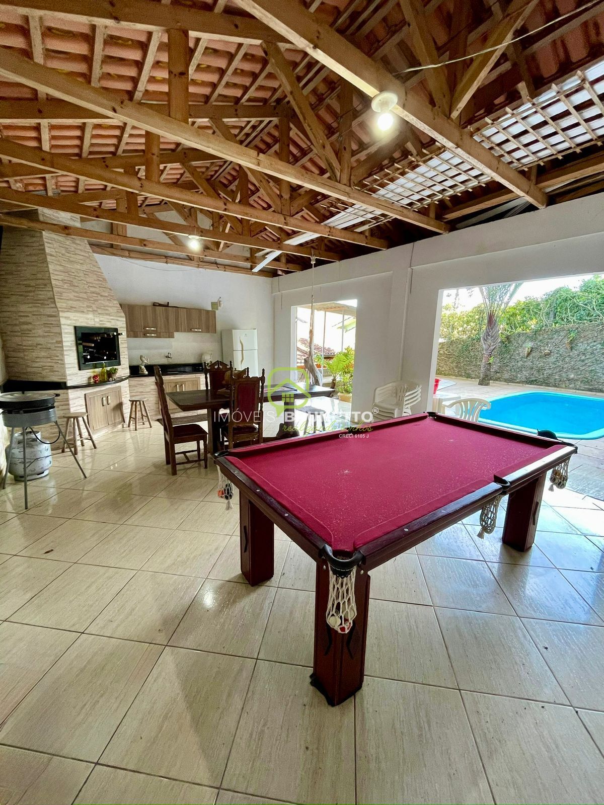 Repartições Internas•Sala de estar ampla com varanda, com boa iluminação natural e ideal para montar um ambiente aconchegante de TV e convivência •Cozinha individual grande, com espaço para bancada, armários e mesa de jantar •3 dormitórios, com privacidade e excelente ventilação •Banheiro social bem distribuído e de fácil acesso aos ambientes internos •Área gourmet integrada com vista para o quintal e piscina, criando um espaço perfeito para lazer e confraternizações •Lavanderia / área de serviço em local reservado •Garagem para até 2 carros, acesso prático e seguro