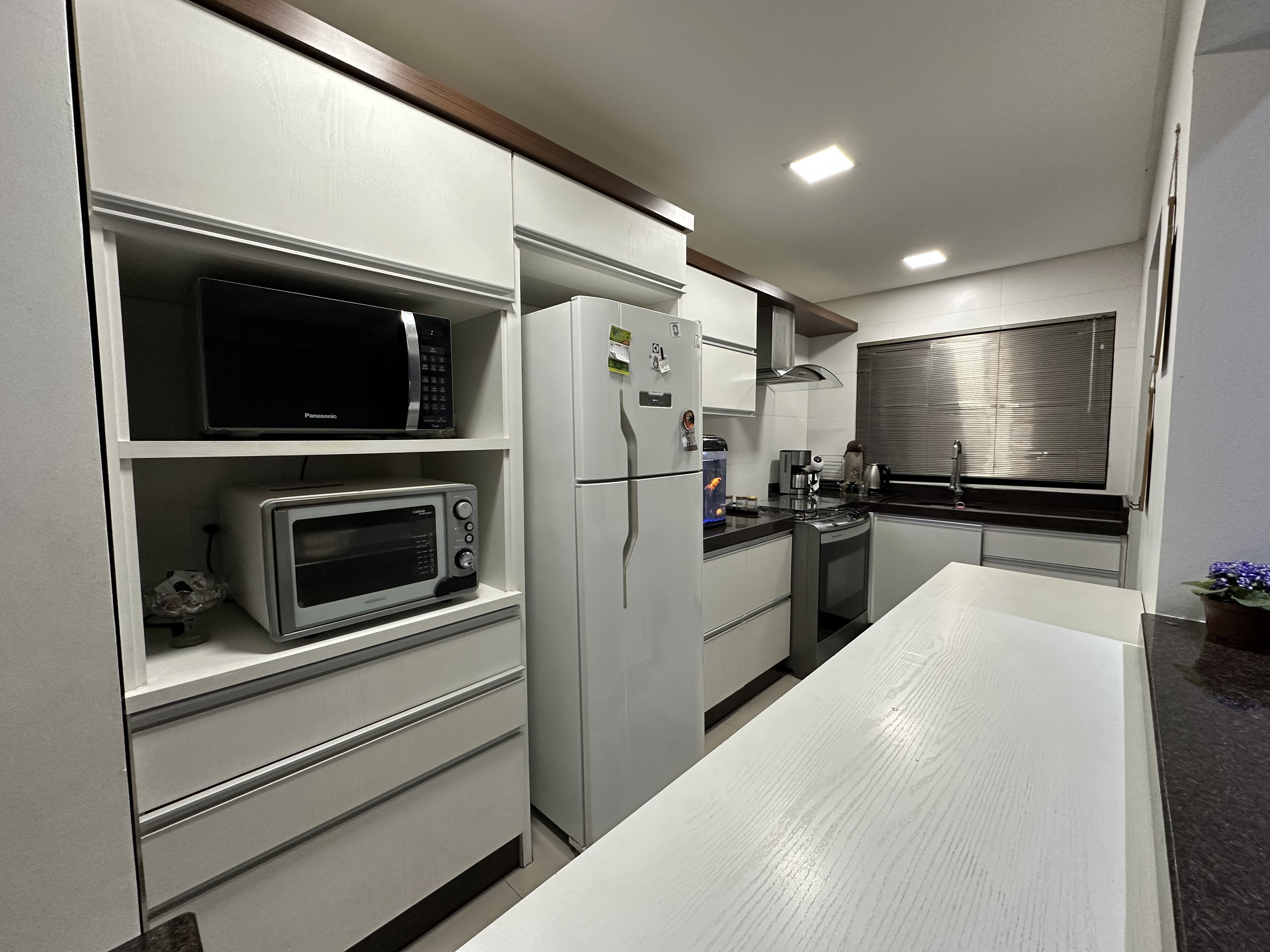 A cozinha com bancadas de mármore, passa-prato, caféimperial para momentos de relax.