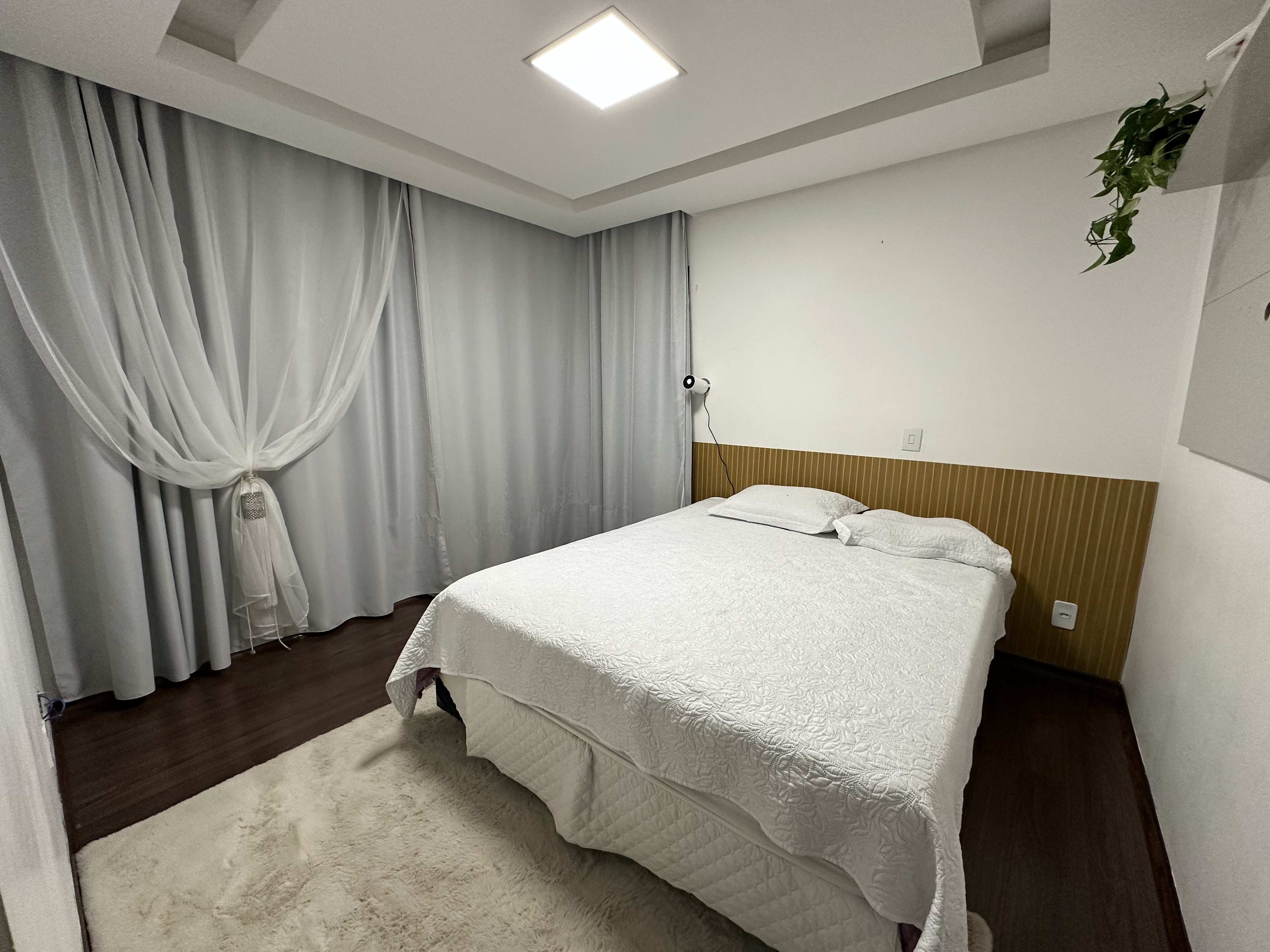 A suíte luxuosa oferece janelas em L de vidro, cascata de luzes de LED e closet espaçoso.