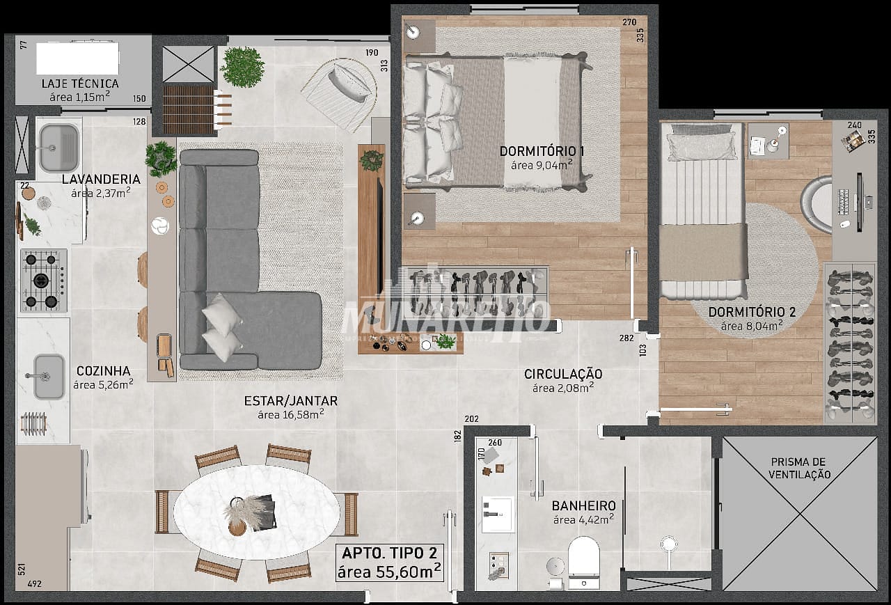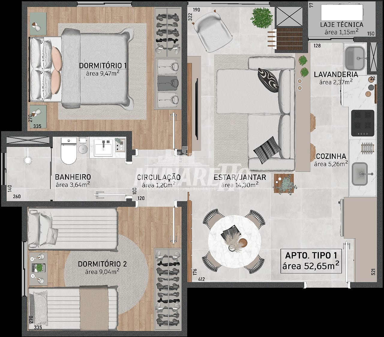- Tipo 1 com 52,66 m² com área total de 84,88 m²