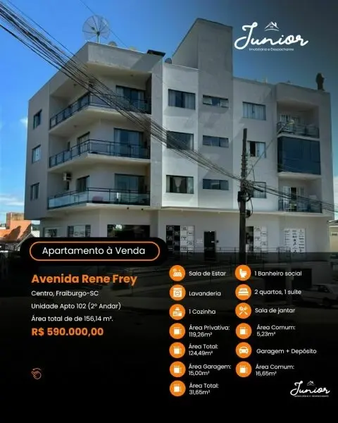 Apartamento à venda no Centro de Fraiburgo – SC! Localizado na Avenida Rene Frey, no coração da cidade, com tudo o que você precisa ao seu redor. Unidade: Apto 102 (2º andar) Área total: 156,14m² Características do imóvel: 1 suíte + 2 quartos Sala de estar/TV Sala de jantar Cozinha Lavanderia Banheiro social Garagem + depósito Imóvel espaçoso, bem distribuído e pronto para morar! Valor: R$ 590.000,00 Agende sua visita com a nossa equipe: 49 99979-5117 Alex 49 99999-1429 Junior CRECI/SC 8886 J #apartamentoavenda #fraiburgo #centrodefraiburgo #juniorimobiliaria #imoveisavenda #oportunidadeimobiliaria