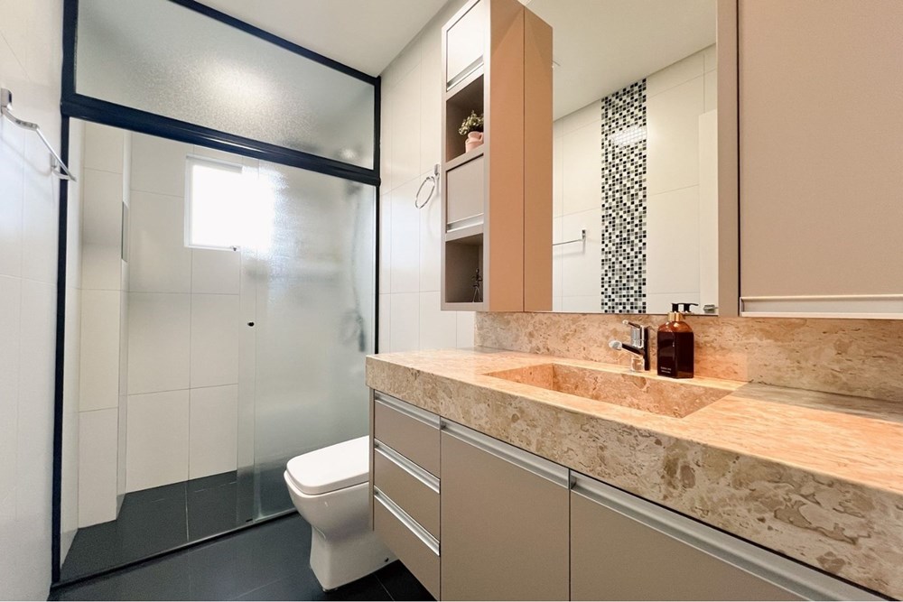 O apartamento possui piso em porcelanato, garantindo sofisticação, durabilidade e fácil manutenção. Além da suíte e da cozinha, há móveis planejados também na sala de estar e em um dos banheiros, agregando padrão superior ao imóvel.