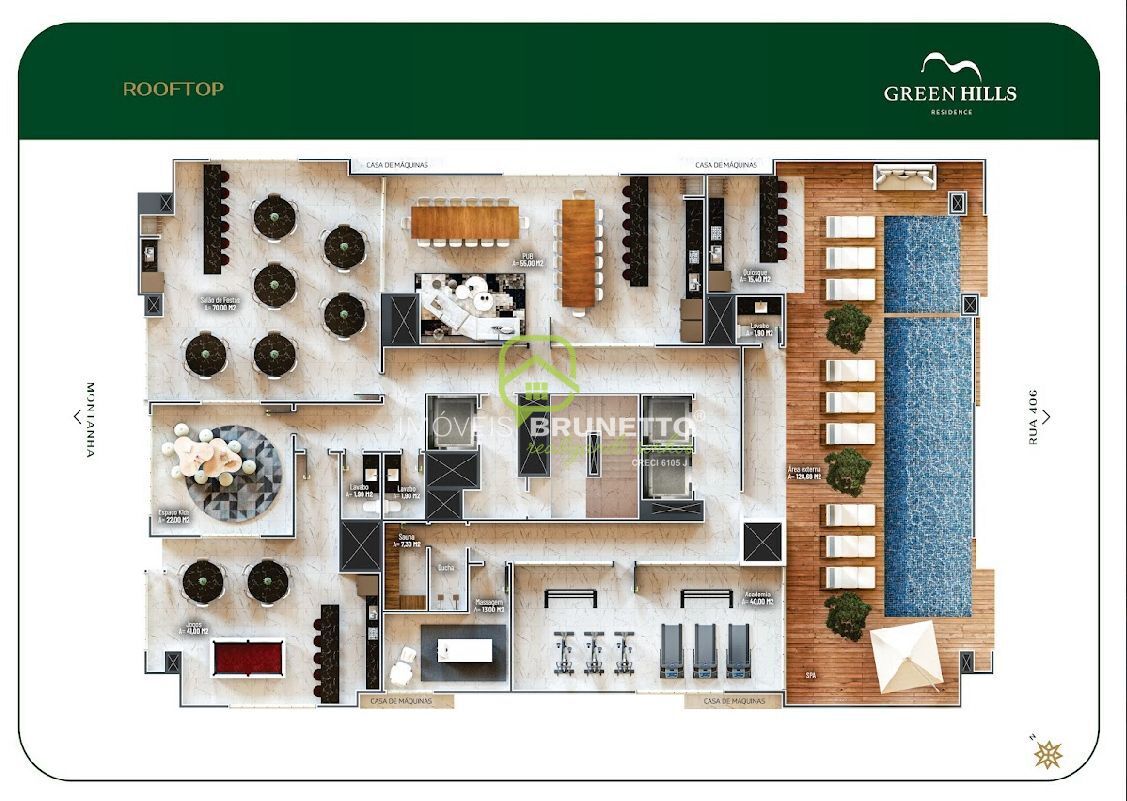 A área de lazer do Green Hills Residence é um diferencial, com 520 m2 no rooftop, que é mobiliado e decorado.