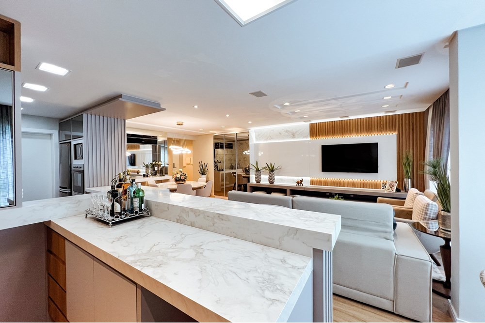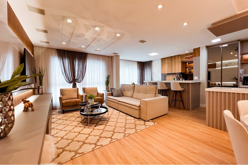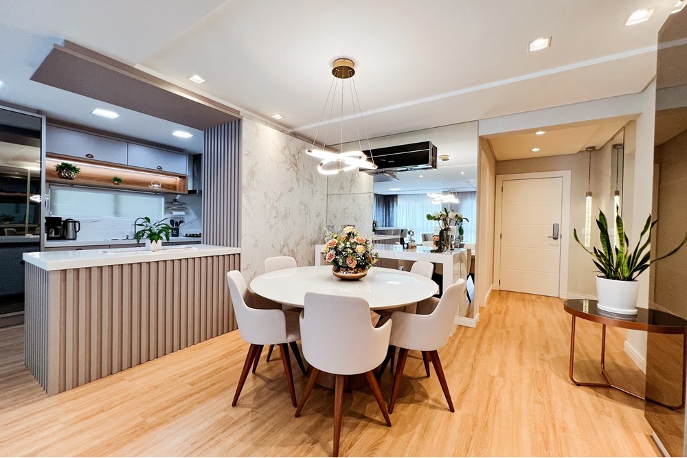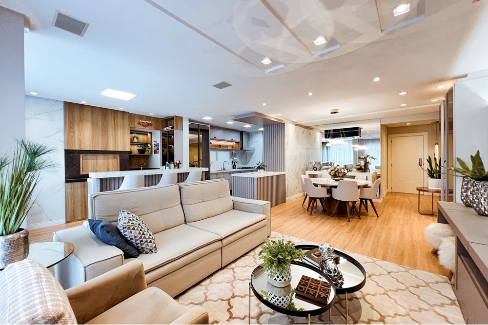 Ambientes integrados, unindo sala de estar e jantar em um espaço amplo e sofisticado ideal para receber amigos ou relaxar com a família.