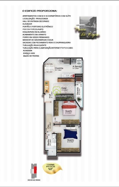 São Apartamentos de 55,12 m2 e 66,33 m2 com: 2 Dormitórios; Sala de Estar e TV; Sacada com Churrasqueira; Copa e Cozinha; Banheiro Social; Área de Serviço e; 1 Vaga Privativa.