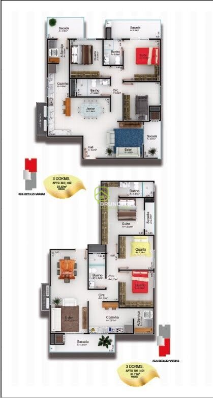 Apartamentos com 93,42 m2 e 97,72 m2 com: Suíte com Sacada + 2 Dormitórios; Salas de Estar e Jantar; Sacada com Churrasqueira; Banheiro Social; Cozinha; Área de Serviço e; 1 Vaga Privativa.