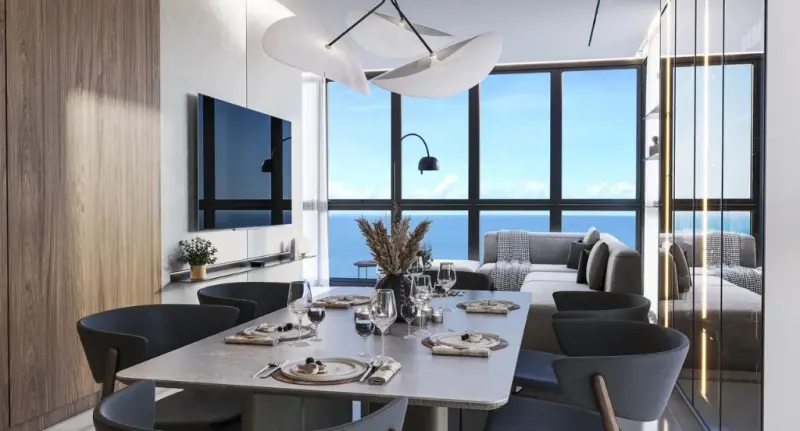 O projeto de interiores valoriza a integração total dos ambientes. O living amplo se conecta a uma sacada com churrasqueira, criando o cenário perfeito para receber amigos e familiares, sempre com o oceano como pano de fundo. As amplas janelas permitem que a luz natural ilumine todo o espaço, realçando os acabamentos de alto padrão que o projeto sugere, como os painéis em madeira e os revestimentos que remetem ao mármore.