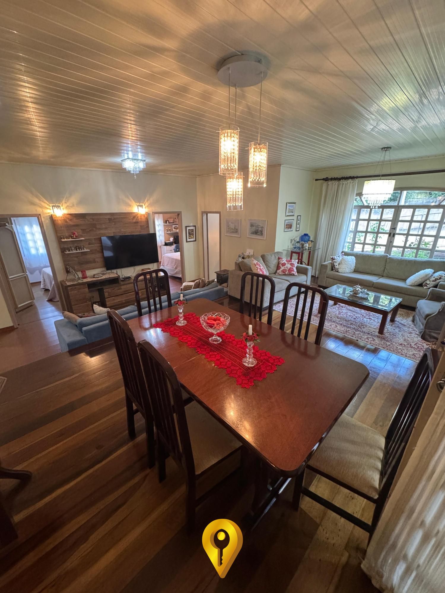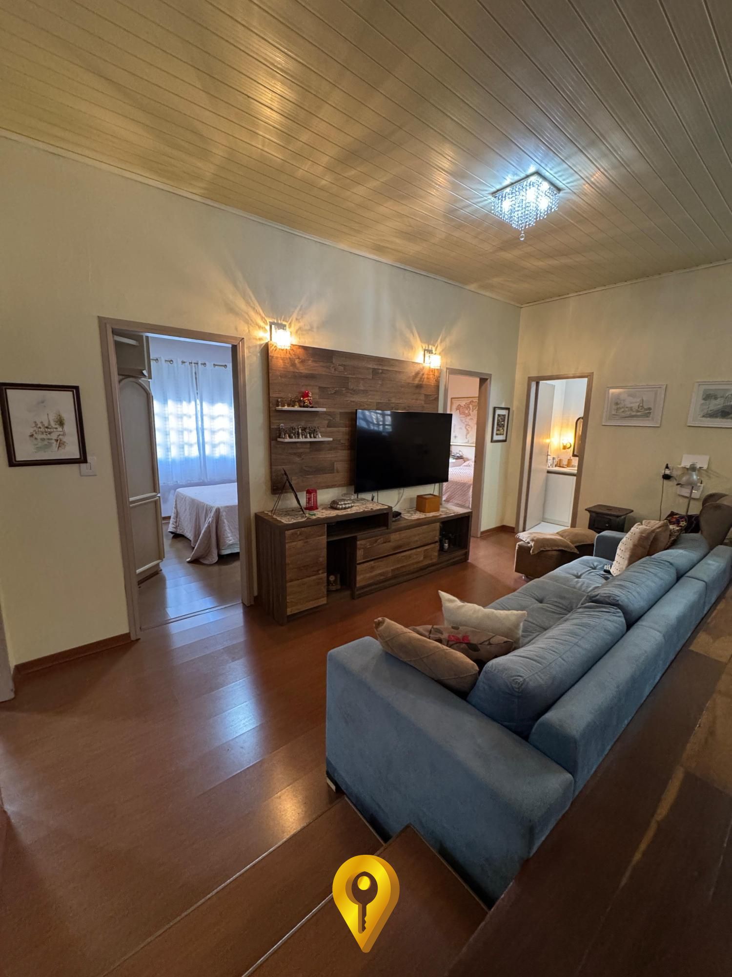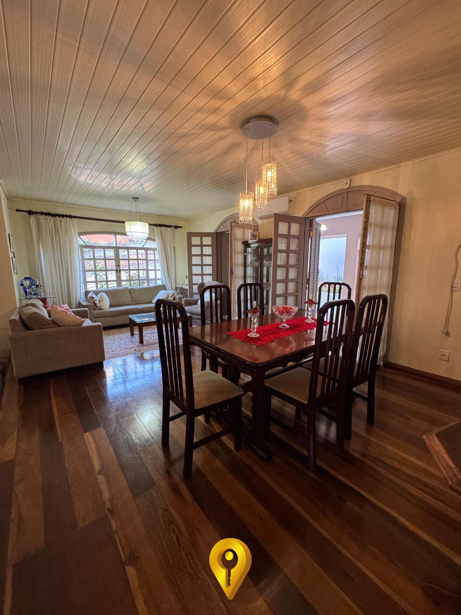 Piso de imbuia na sala, que agrega elegância e aconchego ao ambiente;