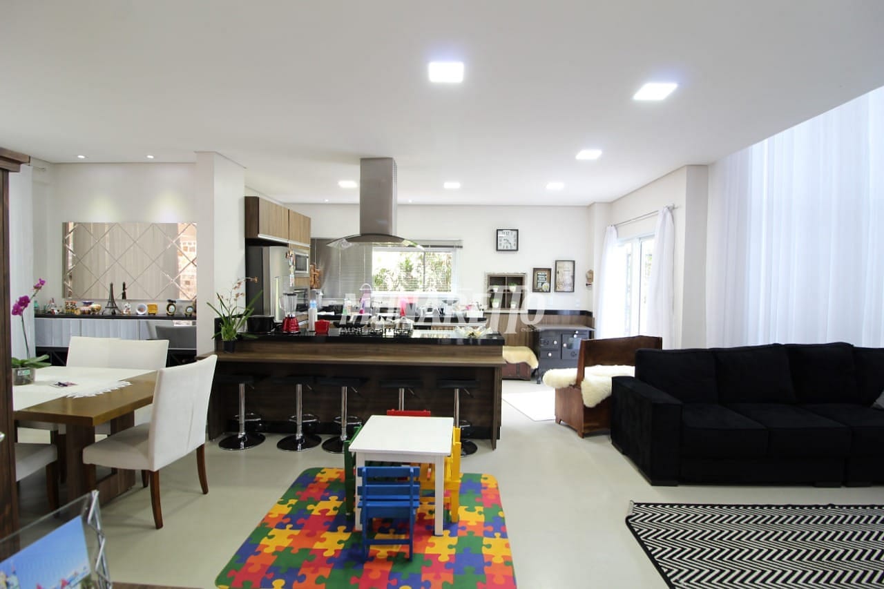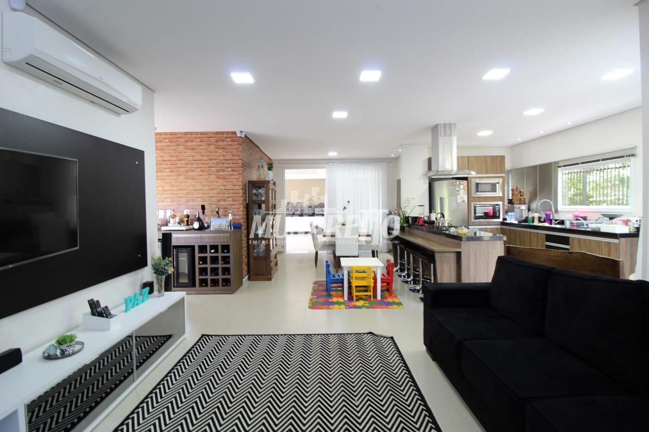 Com 3 suítes, sendo uma 1 suíte Master com banheira, closet, um 1 banheiro social, três salas sendo uma integrada com a cozinha, garagem e área para festa, churrasqueira, closet, quintal e sacada.