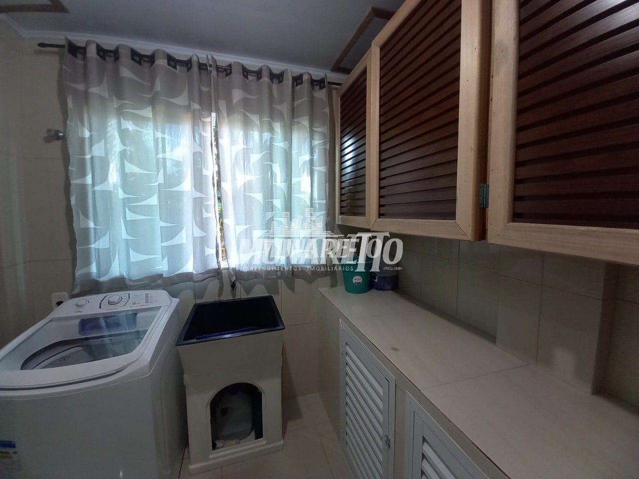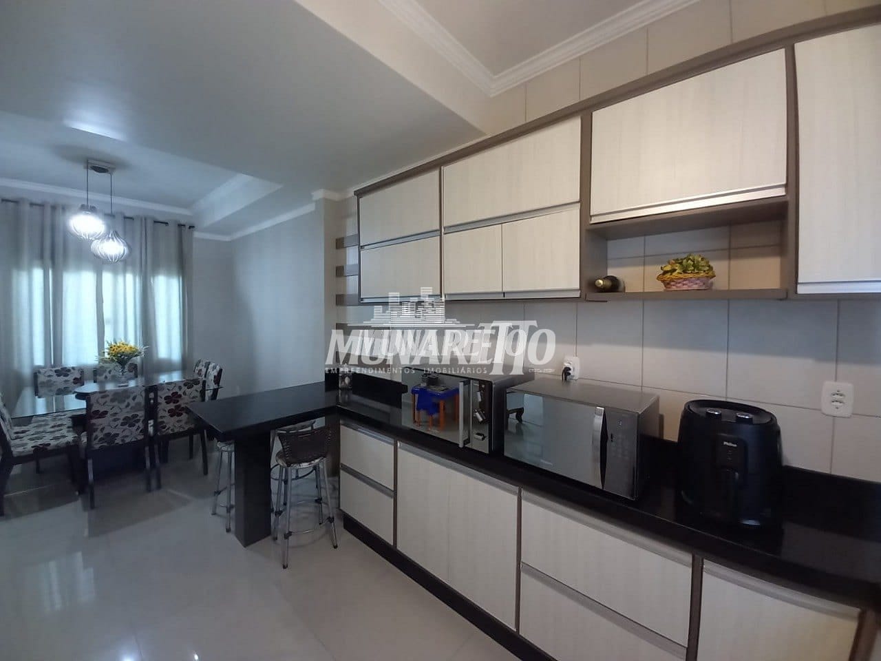 Ficam no imóvel a cozinha planejada, balcões dos banheiros e lavanderia peças decorativas projetadas dos ambientes.