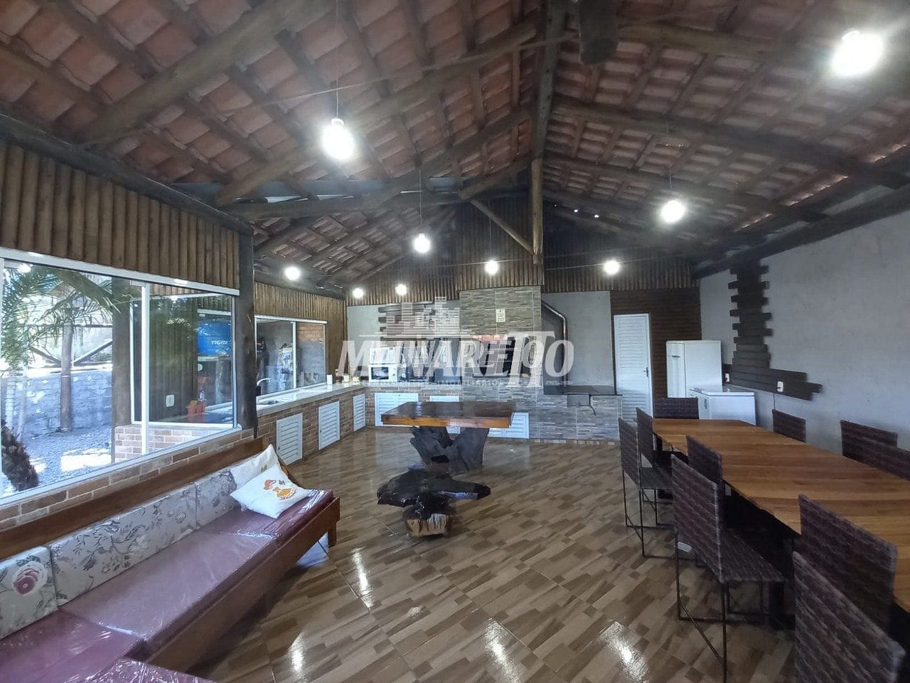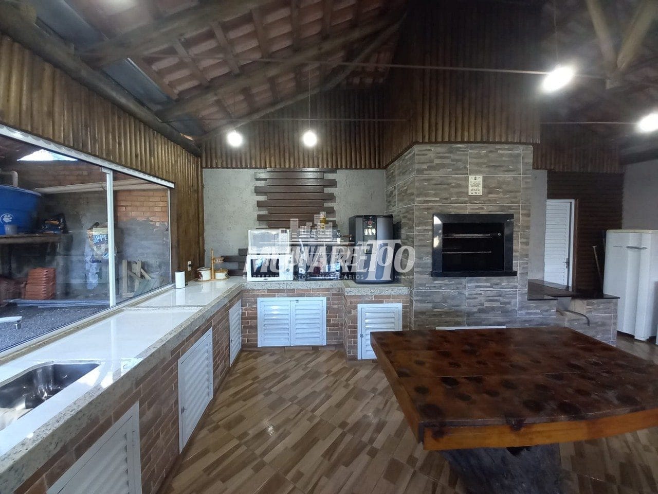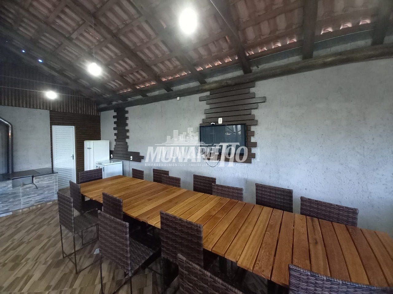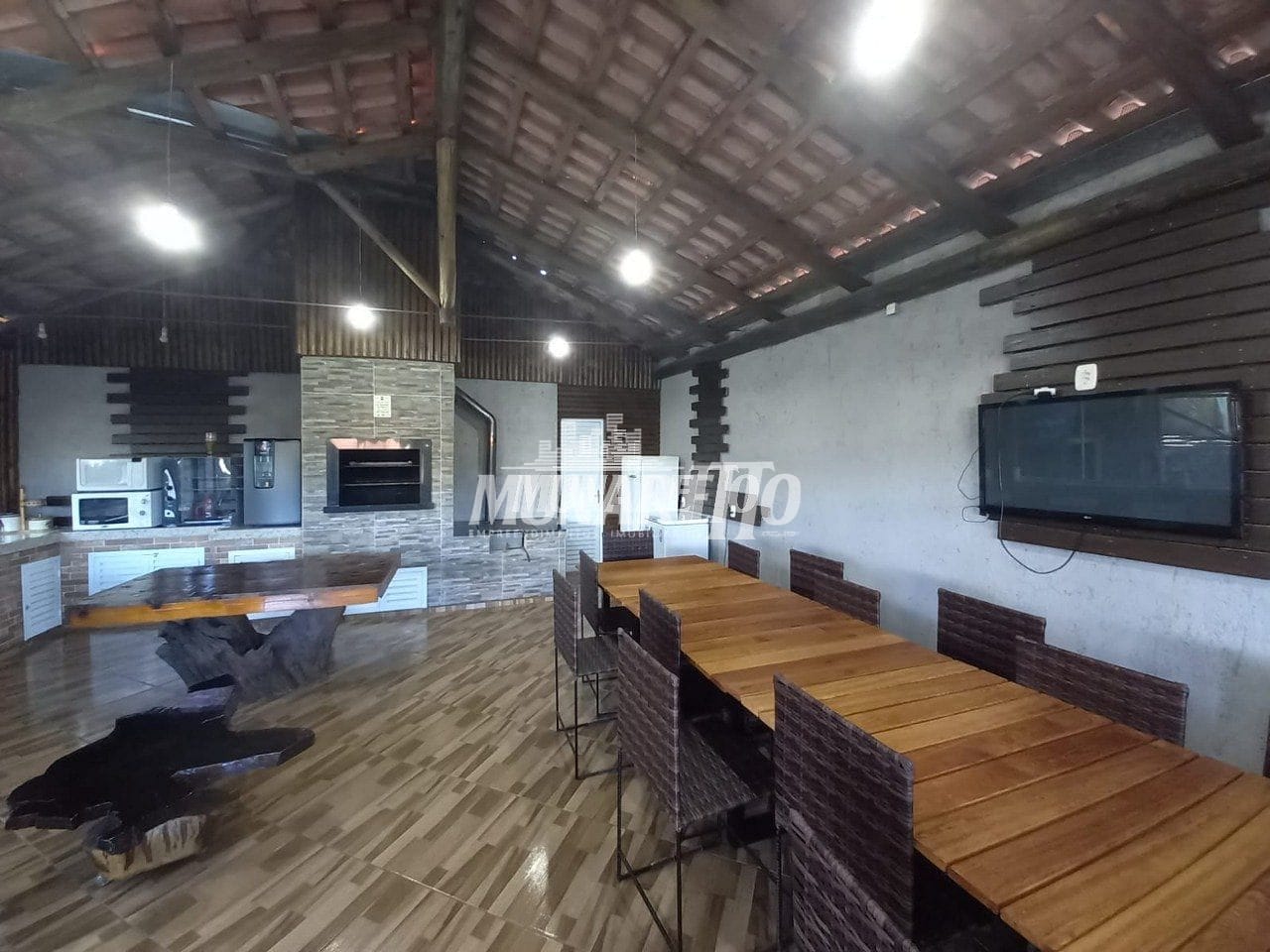 O salão de festas possuí área de aproximadamente 85m² e conta com churrasqueira, fogão campeiro, balcão com pia e lavabo.