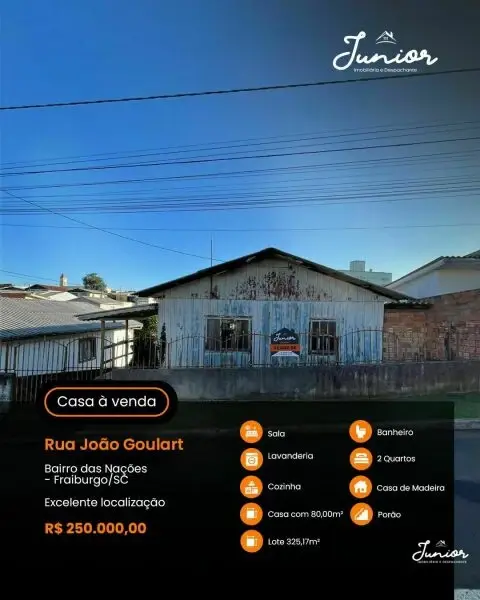 Casa de madeira à venda no Bairro das Nações – Fraiburgo! Localizada na Rua João Goulart, com excelente localização e fácil acesso a tudo que você precisa! Área construída: 80m² Terreno amplo com 325,17m² Características do imóvel: Sala aconchegante Cozinha funcional 2 quartos Banheiro social Lavanderia Porão Amplo terreno com muito potencial Ideal para quem busca tranquilidade, espaço e praticidade! Entre em contato para mais informações: 49 99979-5117 Alex 49 99999-1429 Junior CRECI/SC 8886 J #casademadeira #bairrodasnacoes #fraiburgo #juniorimobiliaria #imoveisavenda #terrenoamplo