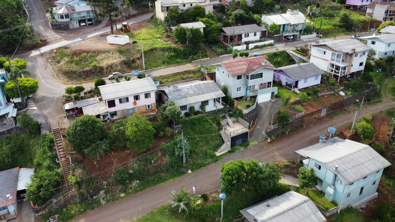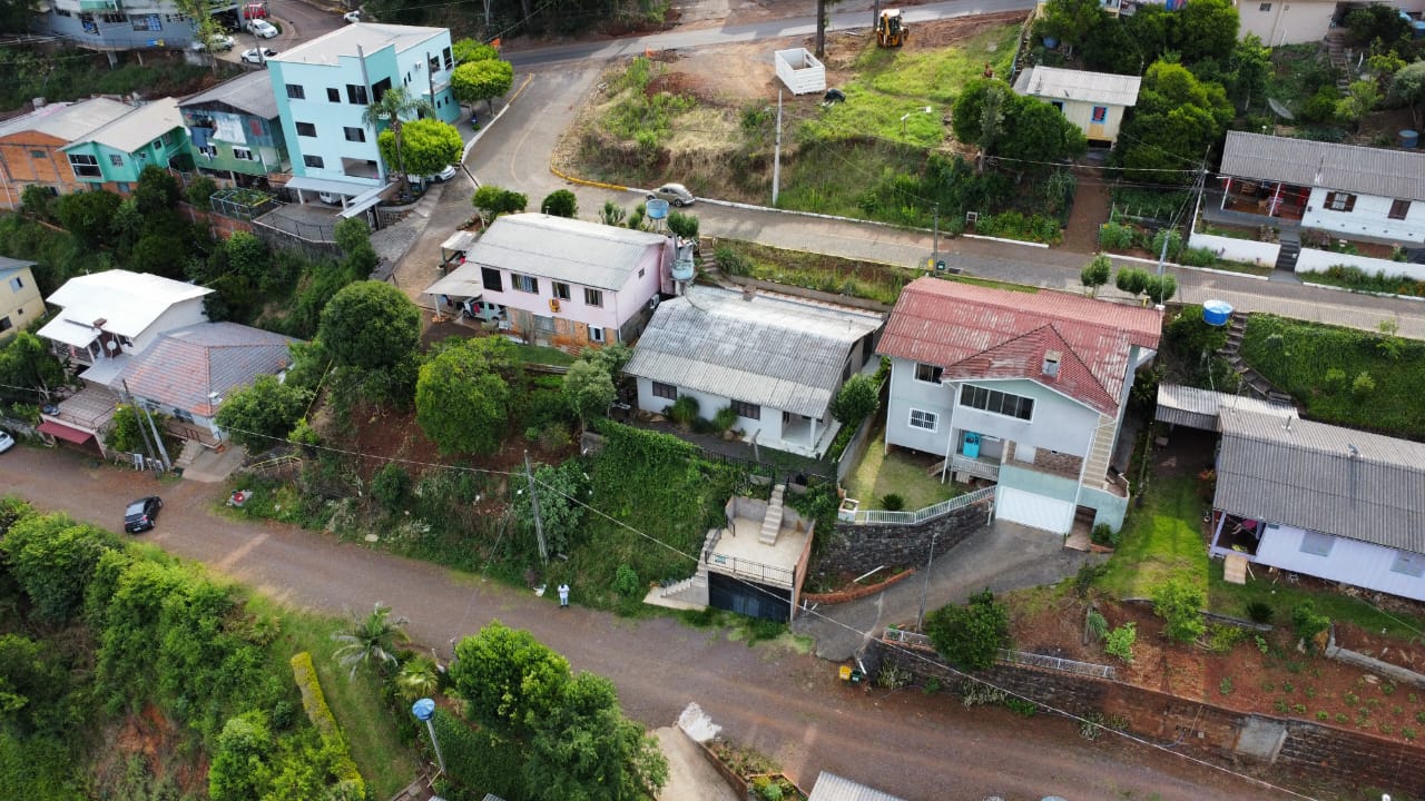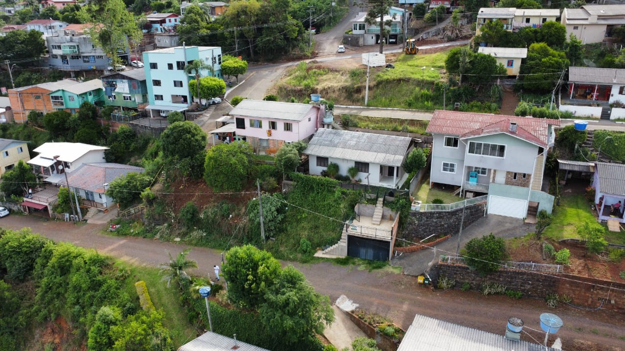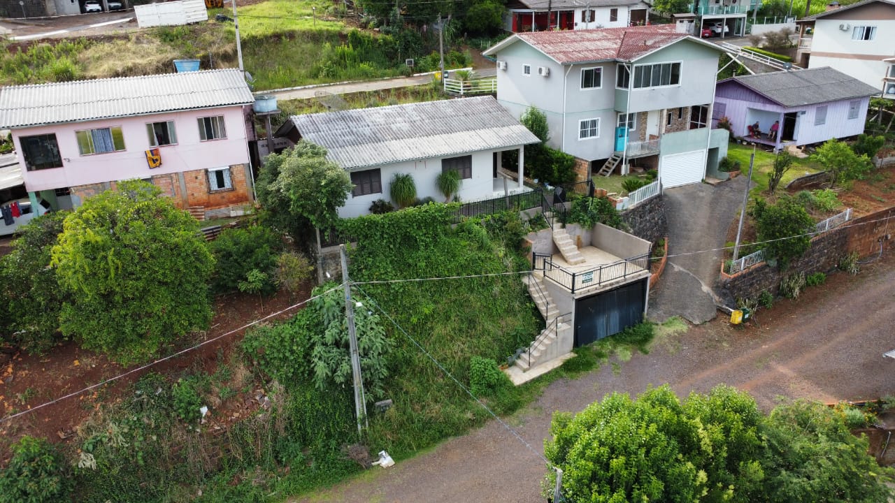 Casa em alvenaria com suíte, três dormitórios, sala, cozinha, área de serviço, banheiro social e varanda de festas com churrasqueira.