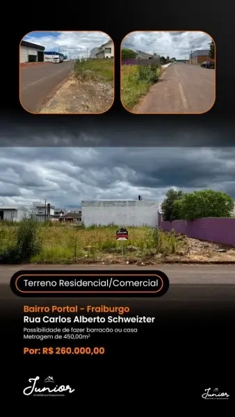 Terreno residencial e comercial à venda no Bairro Portal - Fraiburgo! ???? ???? Localizado na Rua Carlos Alberto Schweizter, em uma área estratégica e valorizada. ???? 450m², com ampla possibilidade para construção de barracão ou residência, ideal para investir ou morar! ????????️ ???? Valor: R$ 260.000,00 Aproveite essa oportunidade única! Entre em contato para mais informações. ???? 49 99979-5117 Alex ???? 49 99999-1429 Junior CRECI/SC 8886 J #terrenovenda #bairroportal #fraiburgo #imoveisavenda #juniorimobiliaria #investimentoimobiliario